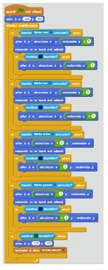 Explication du code : si le lutin touche la couleur choisie pour dessiner le labyrinthe (ici le bleu), alors il reste sur son axe horizontal (X) et recule de 5 sur l’axe vertical (Y). Ceci va donc faire l’effet inverse du déplacement qu’on vient de réaliser suite à l’appui sur la flèche haut. On crée ainsi l’illusion que le lutin n’a pas bougé, comme s’il était bloqué par le mur.